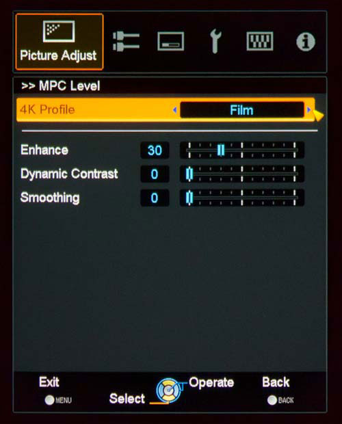 As well as the basic video controls, the [Advanced] submenu houses adjustments for JVC’s edge-adaptive 1080p->2160p (“4K”) upscaling process, in a menu called [MPC Level]. You can leave this option off entirely if you’re not a fan of the “4K E-Shift 2” mode (which we explained in some detail in our review of the JVC DLA-X55). The quick version is that the DLA-X75 is not a 2160p/4K projector, but instead achieves some of the benefits of a higher resolution (namely a less visible pixel grid structure) with temporal pixel shifting tricks. The LCOS imagers in the projector are 1920×1080.
