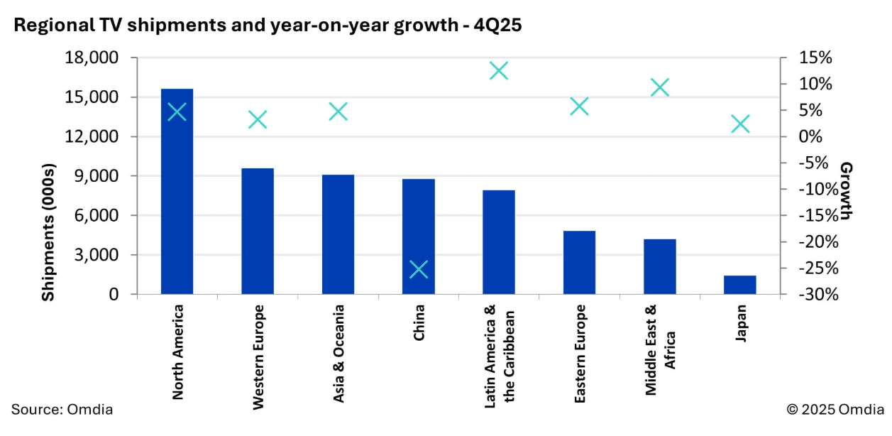 Omdia’s latest market tracker reveals that global TV sales “remained flat” in the final quarter of 2025, despite a big drop in shipments in China, one of the world’s biggest markets.