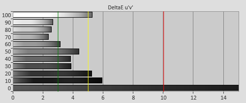 Delta errors (dEs) were suppressed to below 3 (widely considered to be the human perceptible limit), ensuring that greys remained tint-free which, believe it or not, is a key element for accurate colour reproduction. Near-black areas – transmissive display technologies like LED LCDs cannot render true blacks on a per-pixel basis – took on a purplish shade, which is a common trait of IPS (in-plane switching) panels.